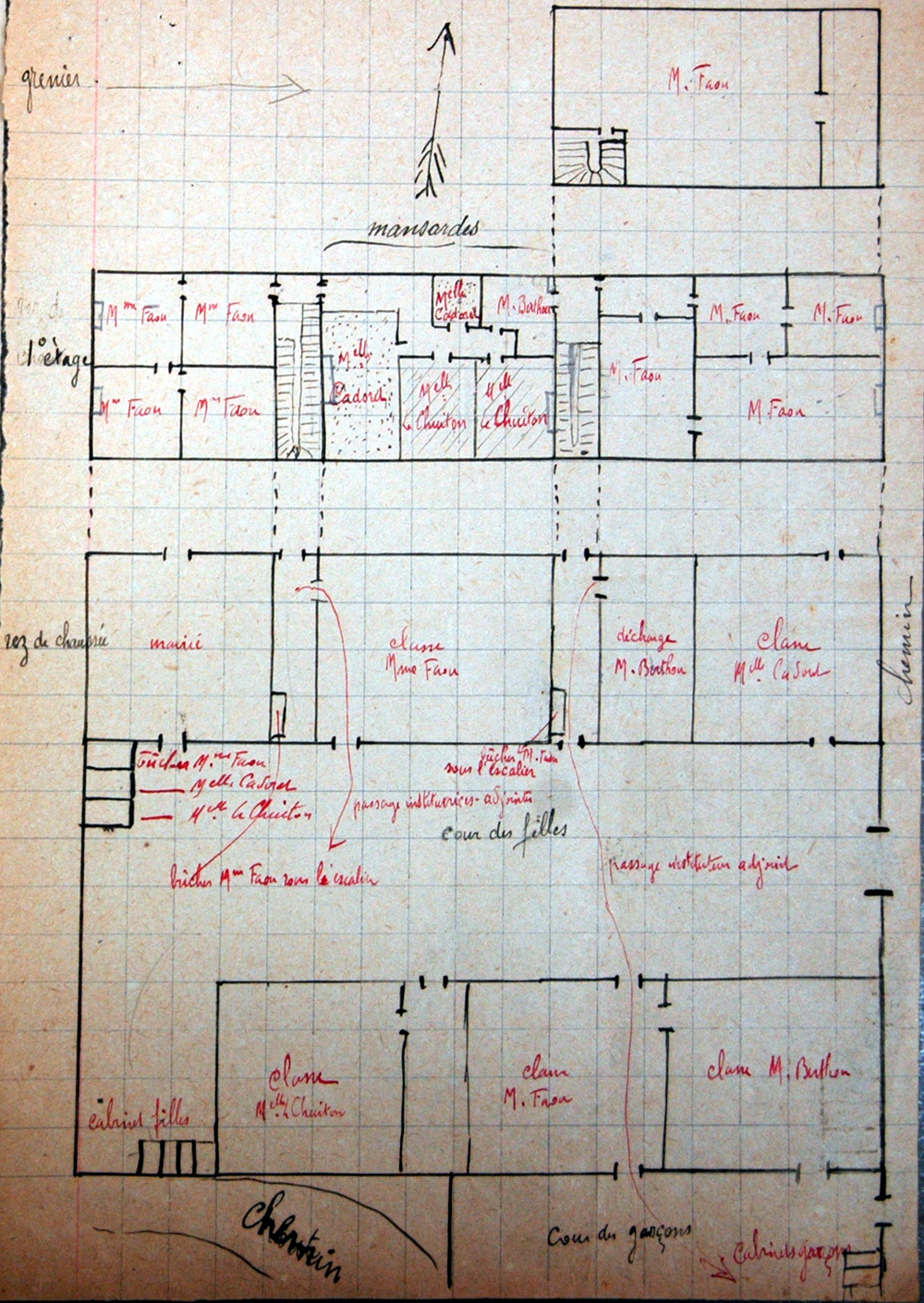 Finalement M. Le Faou accepta une des deux solutions proposées par l'inspecteur primaire : "La dernière nous donne entière satisfaction : Mme Le Faou conserverait son logement, on y ajouterait la grande chambre de Mlle Cadoret et l'ancienne cave, ce qui me permettrait d'abriter mon mobilier. J'abandonnerais le grenier."