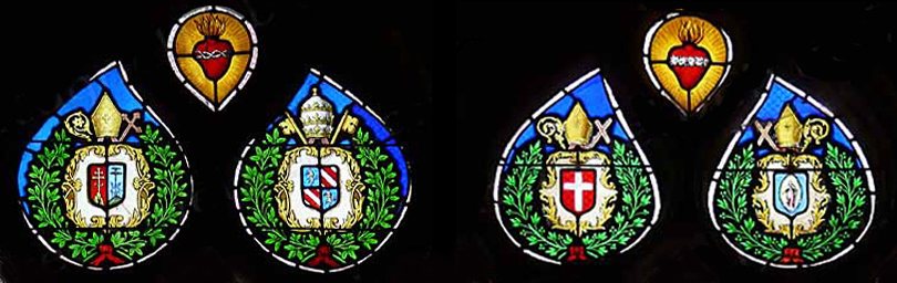 | 1875 | On peut estimer la date de fabrication de ces vitraux et leur mise en place entre 1872 et 1878, car ils comportent, dans leur partie haute, les blasons d'un pape et de trois évêques de Quimper et de Léon. Le vitrail du côté nord contient les blasons de Mgr Nouvel de la Flèche (1872-1887) et du pape Pie IX (1846-1878) et celui du côté sud les blasons de Mgr Graveran (1840-1855) et Mgr Sergent (1855-1871).