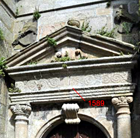 Le clocher porte sa date, 1589, sous le fronton de la porte dans un cartouche orné de motifs décoratifs.