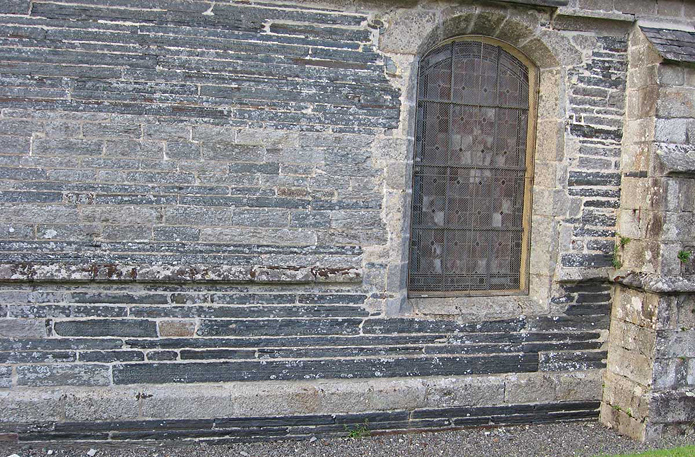 | Mur de schiste de l'église | Pignon de schiste et granit de l'ossuaire |