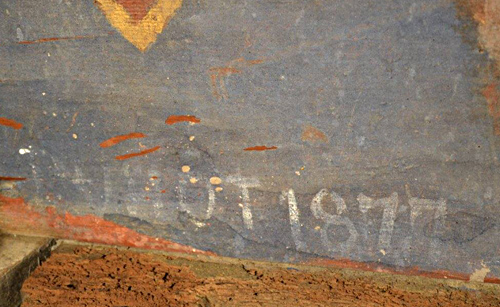 | 1866 1869 1870 | Toiture. Comme dans bon nombre d'édifices de ce genre, c'est la toiture qui exige le plus de soins. On note plusieurs interventions pour éviter les infiltrations et les dégradations au fil des ans. En 1866 et 1869, il y a eu d'importants travaux. C'est ainsi que 24.000 ardoises de petites tailles, du nom de cartelettes, ont été commandées et règlées aux entreprises de couverture appelées à son chevet. Une inscription, visible sur le lambris à droite du vitrail, indique le nom de l'entreprise Duhot qui a effectué le travail en 1870.