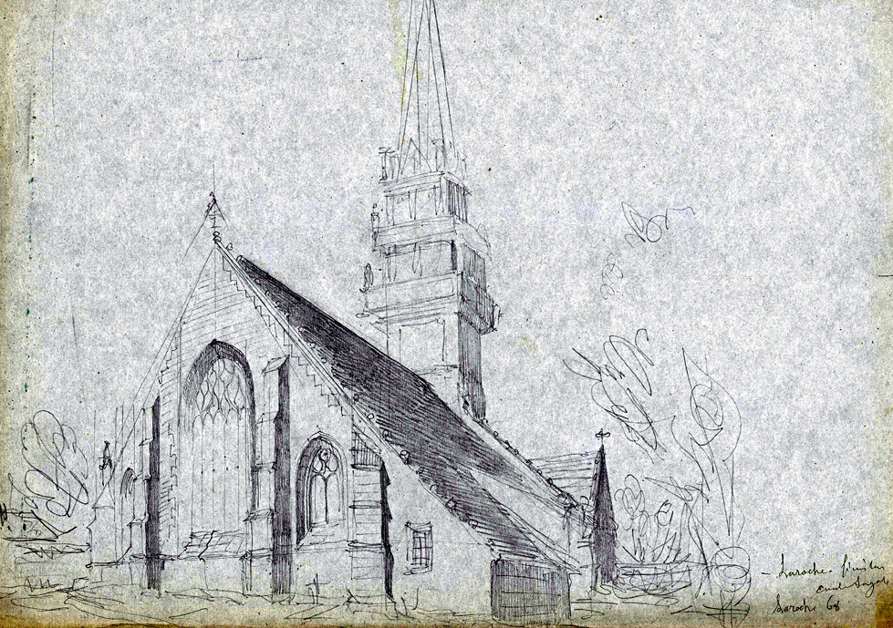 Plus précisement, "la commune de La Roche-Maurice ne dispose comme sacristie qu'un appenti construit contre le flanc nord du choeur, cet appenti long et étroit est humide et n'est éclairé que par une petite fenêtre pratiquée dans le pignon oriental et par suite n'offre aucun emplacement pour servir de dépôt aux objets nécessaires au culte" (source lettre d'accord de la sous-préfecture datée du 6/8/1880 - ADB 1 V 785). Cf un dessin d'Emile Sagot en 1868