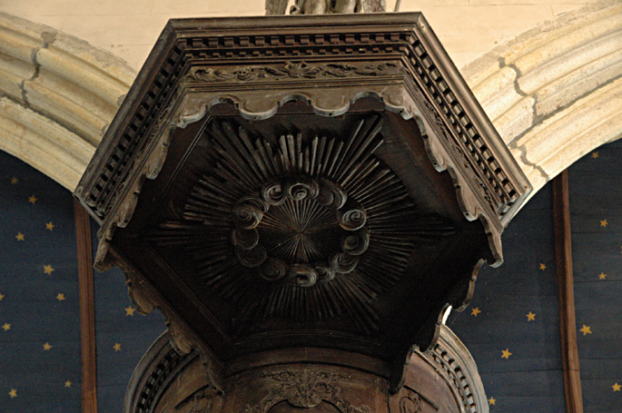 La chaire à prêcher du XVIIe siècle, avec son abat-voix sommé d'un ange à la trompette et les médaillons des quatre Evangélistes.