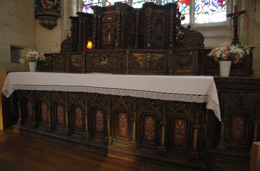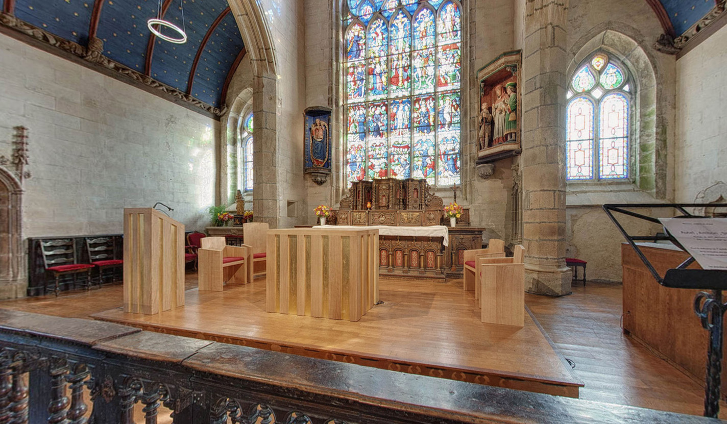 L'entreprise Le Ber a créé et réalisé un ensemble de mobilier liturgique dont l’inspiration est venue de la vie de St Yves : le chêne brut symbolisant le pauvre, et l’or, le riche. La largeur variable des pièces symbolise les différences entre les hommes. L’ensemble est constitué d’un autel, un ambon, quatre sièges d’assesseurs.