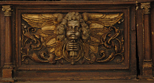 Sur le côté extérieur de la balustrade, bordant l'escalier d'accès à la plateforme du prédicateur, sont gravés les signes suivants : V - M - M - IHS, ce qui signifie Virgo Maria Mater Iesu Hominum Salvator (Vierge Marie Mère de Jésus Sauveur des Hommes).