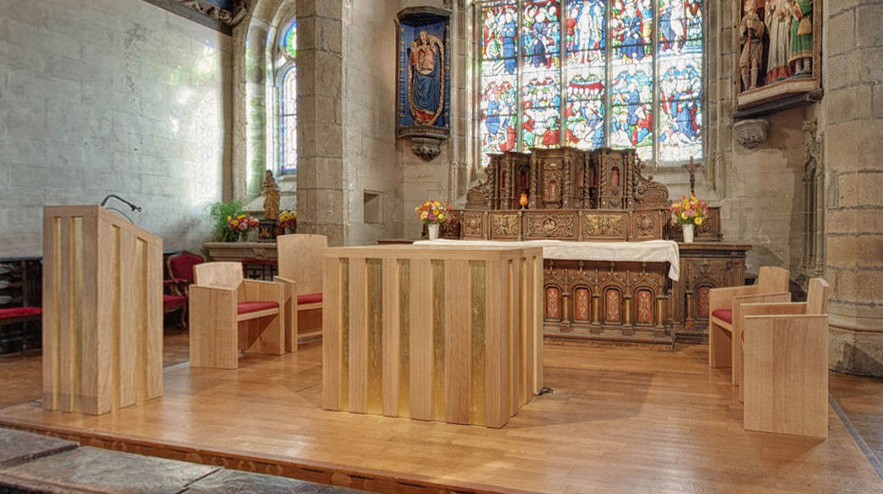 Ewan Le Ber, menuisier et créateur du nouveau mobilier, a expliqué la symbolique de l'autel dont le retable est dédié à Saint-Yves : « Le chêne brut représente le pauvre et les tranches dorées, le riche. Les tranches de bois sont inégales car les hommes sont différents et que ces différences forment le peuple ». Il ajoute que « le dessin et la fabrication du mobilier ont nécessité 300 heures de travail ».