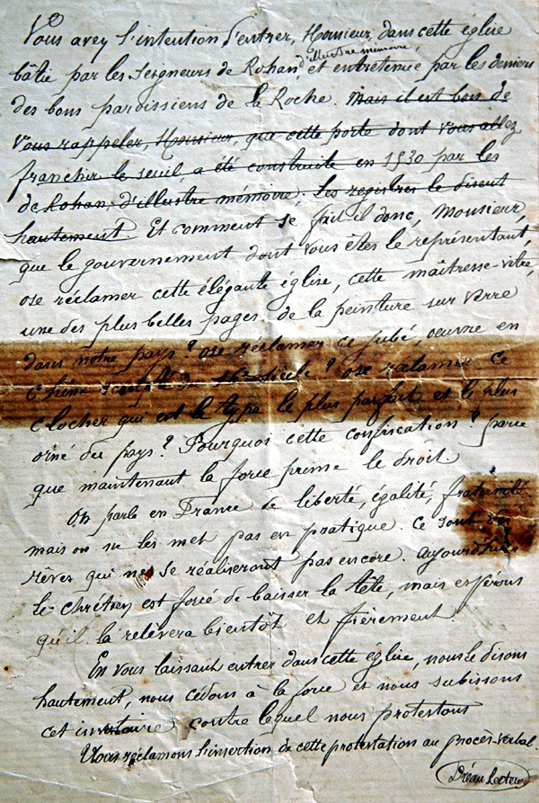 Vous avez l'intention d'entrer, Monsieur, dans cette église bâtie par les seigneurs de Rohan d'illustre mémoire, et entretenue par les deniers des bons paroissiens de La Roche.