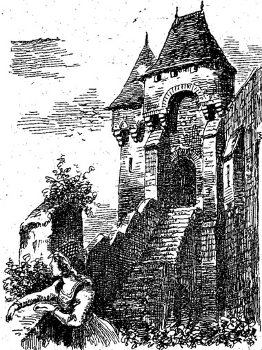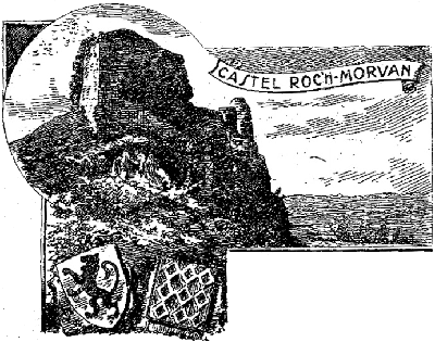 " Le château de la Roche-Morice était un vrai château de Burgrave, un nid de vautour au sommet d'un mont. On y atteint par une pente presqu'à pic, le long de laquelle des blocs de maçonnerie éboulés servent de marches. Tout en haut, par un pan de mur fait de quartiers plats, posés l'un sur l'autre, et où tiennent encore de larges arcs de fenêtres, on voit toute la campagne : des bois, des champs, la rivière qui coule vers la mer, le ruban blanc de la route qui s'allonge, les montagnes dentelant leurs crêtes inégales, et la grande prairie qui les sépare en se répandant au milieu". ...