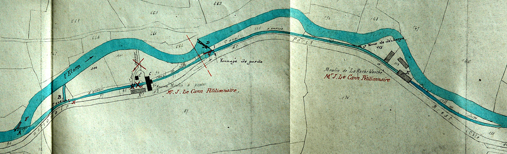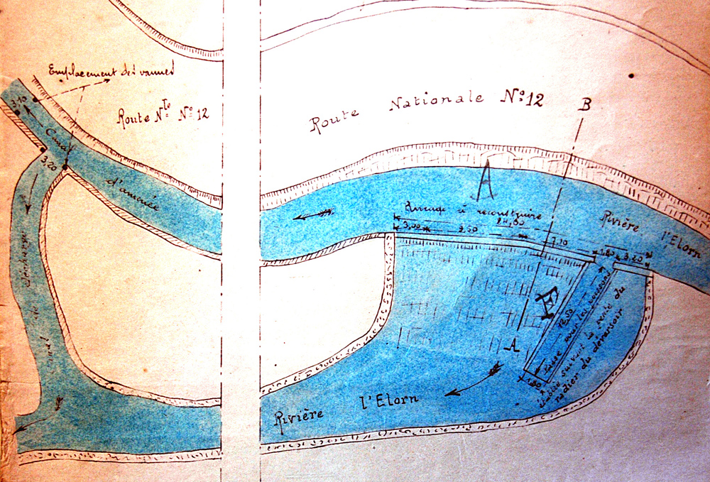 Nous venons d'acquérir sur la rivière l'Elorn entre les moulins Morvan et Lehideux une chute d'eau. Désirant appliquer cette chute à une minoterie nous vous adressons, ci-joint, un plan des lieux avec indication des deux endroits où nous projettons d'établir le déversoir.