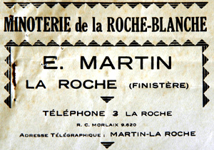 " La minoterie de La Roche-Blanche consistant en un vaste bâtiment renfermant le mécanisme et servant de magasin, bordant la route impériale n° 12 de Paris à Brest. Ce bâtiment est élevé de trois étages sur rez-de-chaussée. Le mécanisme se compose de 8 paires de meules, montées à l'anglaise avec tous leurs accessoires, mûes par une turbine de la force de 50 chevaux, alimentée par un canal ayant sa prise d'eau sur la rivière d'Elorn au moyen d'un barrage qui se trouve à l'extrémité de la propriété.