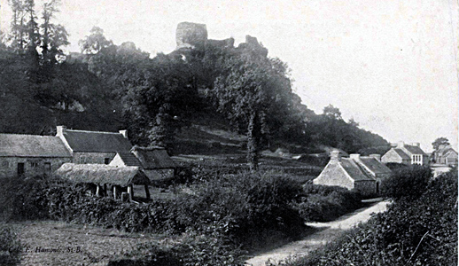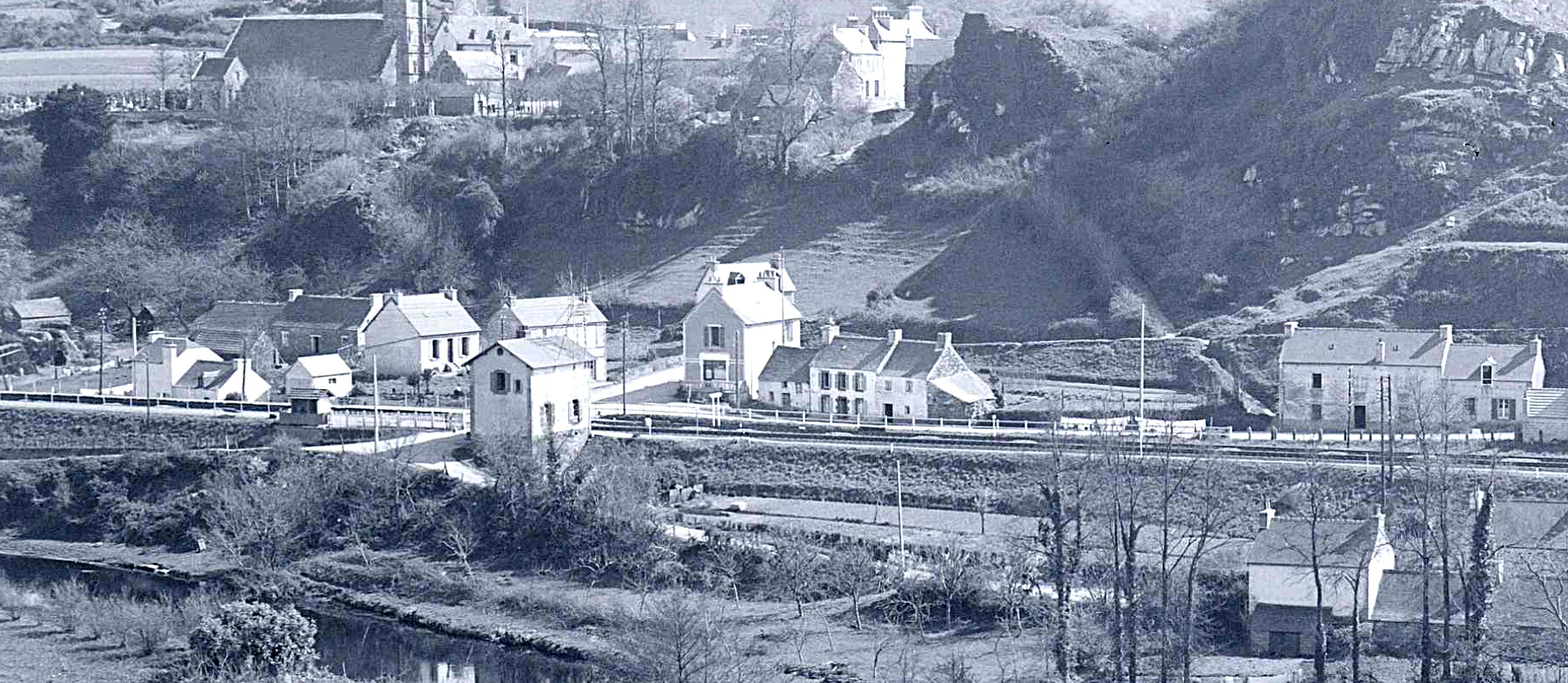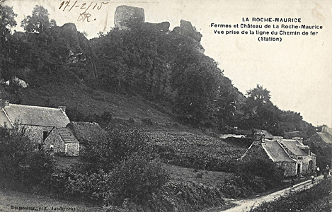 . La ferme sur la gauche correspond au n° 48 du cadastre rénové et les deux petites maisons au bord de la rue aux numéros 46 et 47. Les maisons du fond, que l'on aperçoit bien sur la première photo, sont situées après la route du château, au bord de l'ancienne route de Landerneau. A cette date, avant 1915, ni la maison Herry, commerçant ambulant, (qui sera plus tard la boucherie de Thérèse Poder), n° 45, ni celle du "Café de la Gare" n'étaient encore construites.