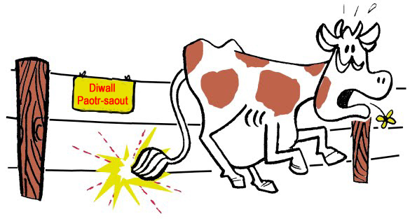 Nous avons rendu visite à un cultivateur de notre campagne et nous nous sommes enquis près de lui de son opinion sur les paotr-saout. " En ce qui me concerne je me déclare très satisfait des clôtures électriques, qui nous procurent la tranquilité quant au maintien et au gardiennage de mon troupeau dans une parcelle bien déterminée... Celles-ci me permettent également, de par leur mobilité, le rationnement des pâturages et par lui-même un plus grand rendement. Au lieu de se nourrir par des aliments portés aux étables, les bêtes vont les prendre aux champs, d'où un gain de temps et de personnel, impossible sans ue clôture électrique..."