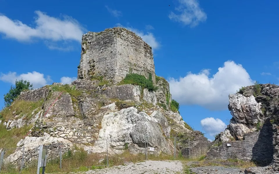 A droite, se trouvait le fossé et le pont-levis précédé du pont dormant. Au fond, on voit les ruines de la tour d'artillerie, avec en bas à droite quelques belles pierres de schiste.