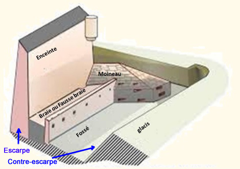 " En l’état actuel des connaissances sur le château et sa topographie, le pont-levis mentionné dans un devis de charpenterie en 1493 ne pouvait qu’être en lien avec une porte dans M 2416 (mur de braie partant de la tour d'artillerie, voir sur le plan plus haut), peut-être en face de la porte de l’enceinte basse. On ne peut que regretter, de ce point de vue, l’importance des dégradations occasionnées par de nombreuses tranchées électriques à cet endroit, mais aussi la récupération assez poussée des matériaux dans le secteur : l’emplacement exact de ce pont-levis ne pourra sans doute être documenté que par une intervention dans le fossé comblé, via d’éventuels vestiges de pont dormant ".
