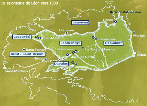 Les fiefs de Léon en vert sont ceux de la branche cadette après le démembrement de la vicomté réalisé par Henri II Plantagenêt. La branche aînée, Guyomarc'h de Léon, ayant conservé les territoires plus au nord (Lesneven) et le pays d'Iroise actuel (sauf la bande de Coatmeal).