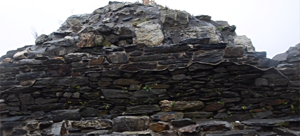 Lors de la cristallisation et le remontage d'une partie des murs avec les éboulis présents sur place, une marque est insérée entre les pierres pour mémoriser la hauteur réelle des murs au moment des fouilles.