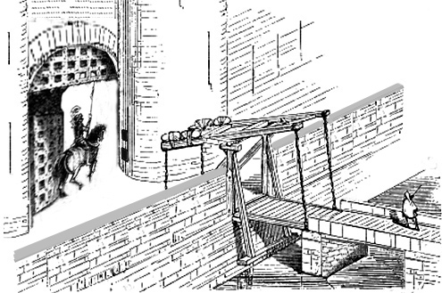 Porte d'accès à l'enceinte basse, encadrée de deux tours, précédée d'un pont fixe et d'un pont-levis.