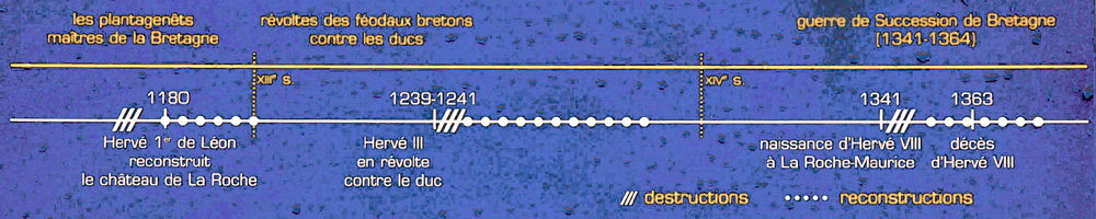Vers 1180, suite aux révoltes du vicomte de Léon Guyomarc'h contre le roi d'Angleterre Henri II Plantagenêt, ses possessions sont partagées entre ses deux fils. Le cadet, Hervé Ier, s'établit dans la vallée de l'Elorn : il est le fondateur du lignage des seigneurs de Léon, tous prénommés Hervé. Son petit-fils, Hervé III, se révolte contre le duc Jean le Roux en 1241 : son château de La Roche-Maurice est semble-t-il pillé, Hervé III périt et son fief est temporairement confisqué par le duc. Ce n'est qu'en 1260 qu'Hervé IV de Léon fait sa soumission et entreprend sans doute la reconstruction de son château. Durant le siècle de paix qui suit, ses successeurs partagent leurs séjours entre La Roche-Maurice et le château de Joyeuse-Garde, édifié en lisière d'une forêt à l'ouest de Landerneau, leur "capitale". La guerre de succession de Bretagne, commencée en 1341, met fin à cette période de paix.