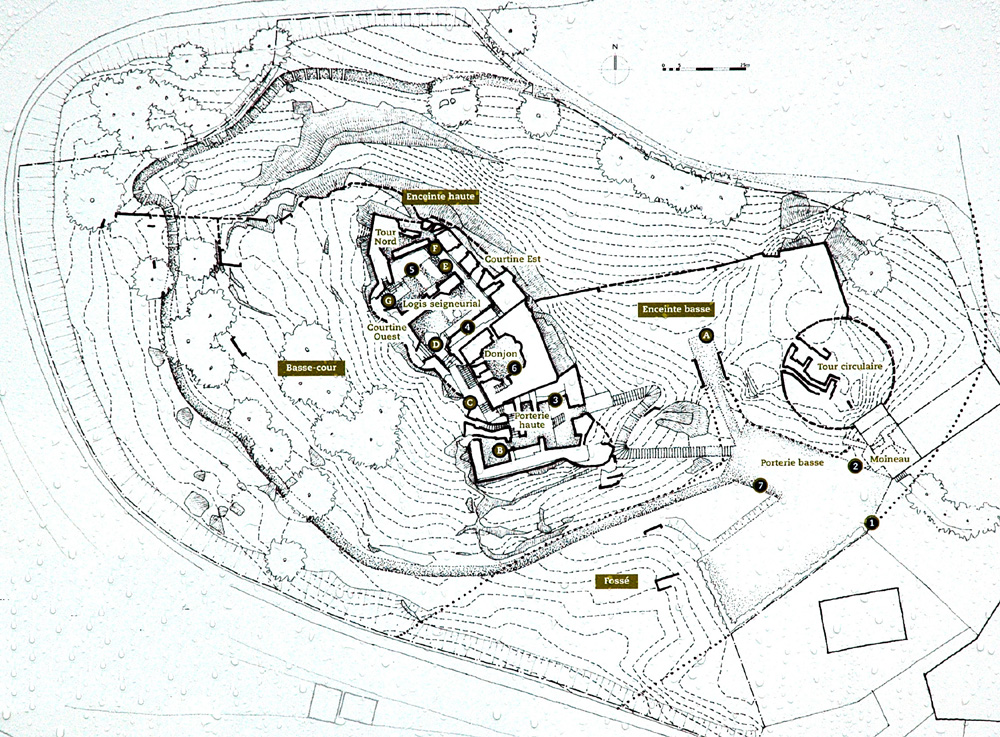 , dont la vocation est à la fois résidentielle, défensive et symbolique. La tour est en effet un signal fort du pouvoir seigneurial. Cela explique qu'elle ait été réparée de nombreuses fois, comme en attestent les multiples reprises de maçonnerie. L'étude archéologique des parements externes a permis d'identifier au moins cinq phases de construction différentes, entre le XIè et le XVè siècle. Le premier niveau, aveugle, est comblé sur environ 5 mètres d'épaisseur. Ces remblais non fouillés constituent une "réserve archéologique" qu'il est important de préserver pour les générations futures. Le deuxième niveau était accesible par la porte ouest, seul accès à la tour, logé en hauteur. La salle est ici agrémentée d'une cheminée à hotte conique qui indiquerait la présence d'une chambre ou d'une pièce d'apparât. Le troisième niveau était couvert par une voûte d'arête dont il ne reste plus que les retombées aux angles.