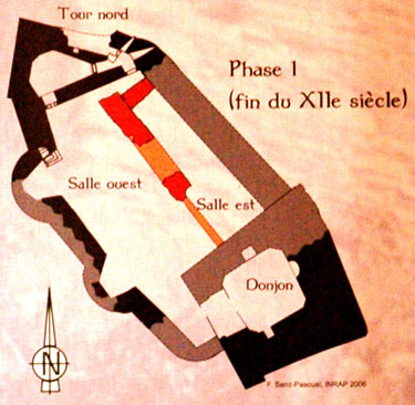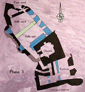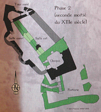 Les reprises de maçonnerie ont permis aux archéologues d'affirmer que la courtine qui s'était effondrée à l'est, fut rebâtie de fond en comble dans la seconde moitié du XIVè siècle. Un glacis incliné vint en outre renforcer la base nord du donjon. La grande salle primitive fut surélevée de deux étages et largement éclairée par deux travées de fenêtres, côté est.