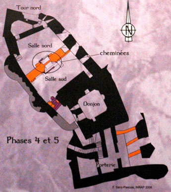 Salle 5 : Autre partie du complexe culinaire. Salle accolée à la courtine nord-ouest, avec une cheminée contre le mur ouest. Cette présence "permet d'envisager une fonction liée à la cuisine, dès le XIVè siècle, d’autant plus que cette salle est le seul accès à la salle 3 située en contrebas, identifiée comme une glacière ou une citerne".