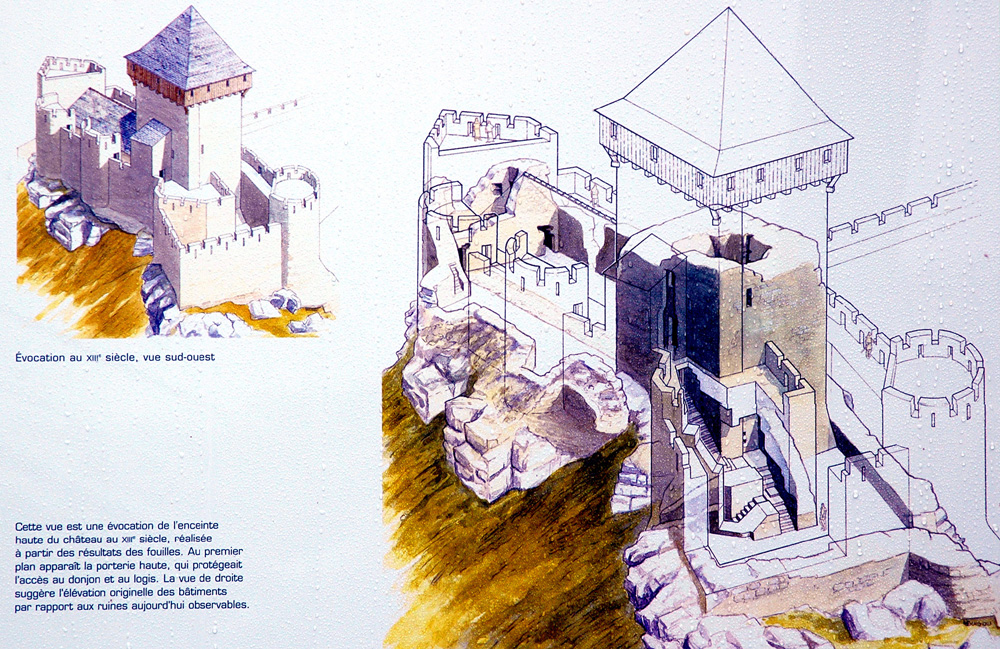La forteresse en pierre construite vers la fin du XIIème siècle, adaptée à la topographie complexe du site, se composait d'un donjon au sommet du piton rocheux et de bâtiments entourés de murailles. A l'ouest et au sud, des petites tours semi-circulaires permettaient aux archers de tirer le long du rempart.