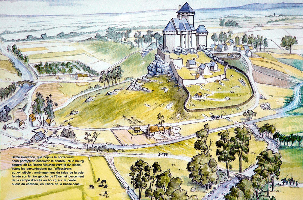 A partir de ce plan cadastral, des connaissances sur les bourgs castraux et de la toponymie, on peut proposer une reconstitution du plan du bourg de La Roche-Maurice vers la fin du Moyen-Age. Dans le haut-bourg, qui comptait peut-être dix à vingt maisons au XVè siècle, s'élevaient un four banal et un auditoire de justice et l'église. D'autres équipements existaient en contrebas du château, dans le bas-bourg : un moulin, un pont et un jardin seigneurial appelé "Le Verger".