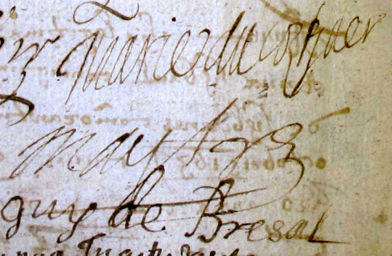 Pourtant, voir la photo ci-dessus en tête de ce chapitre, elle laisse une belle signature tirée d'un aveu de 1628. On peut voir aussi celle présente sur un acte de baptême à Lanneuffret en 1638, associée à celle de son fils Guy de Brezal.