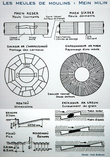 La paire de meules réservée au blé noir, qui avait été repiquée plus tôt dans la saison, était en silex et les deux autres en meulière de La Ferté-sous-Jouarre. Le silex s'usait moins vite mais aurait été trop dur pour les autres graines.