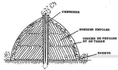 Le premier travail consistait à disposer le bois en forme de meule d’une hauteur de 1.50 m à 2.00 m à la manière d’une grosse meule de foin. Au centre se trouvait une cheminée. Ensuite, il fallait recouvrir cette meule de terre, d’herbe et de feuilles pour l’étancher et permettre une combustion lente et sans flamme.