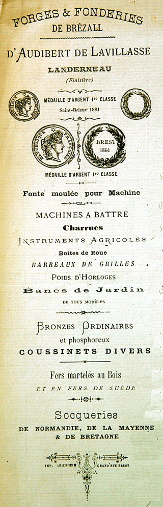 | 1879-1890 | Léon d'Audibert de Lavillasse | Léon d'Audibert de Lavillasse créa, par un acte du 7 octobre 1879, une Société en nom collectif L. D'AUDIBERT DE LAVILLASSE et LE MARCHANT (fabrication du fer), à Plounéventer. Durée : 10 ans. Cap : 20.000 fr. pouvant être porté à 30.000 fr. (source Archives commerciales de la France. Journal hebdomadaire). On pourra lire les statuts de la société dans le paragraphe intitulé "les fondeurs". Voir dans un autre chapitre la famille de Léon d'Audibert de Lavillasse et celle d'Alexandre Le Marchant de Trigon. Léon d'Audibert de La Villasse fera faillite en 1890. |