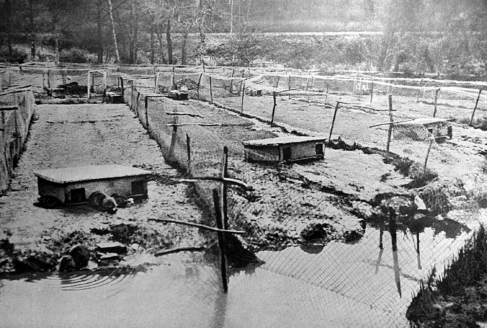 Petits parcs en bordure d'un ruisselet d'eau courante dans lequel les ragondins ont librement accès. Chaque parc est doté d'une niche en tôle divisée en deux compartiments, avec couvercle mobile. Au fond on reconnaît la ligne de chemin de fer Paris-Brest.