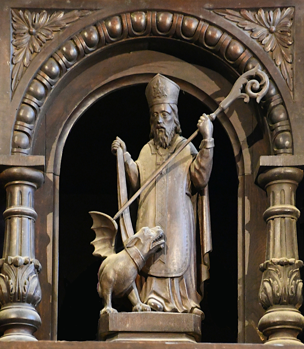 Saint Servais est souvent représenté avec un dragon, comme ici sur le dais des fonds baptismaux de l'église, ci-contre.