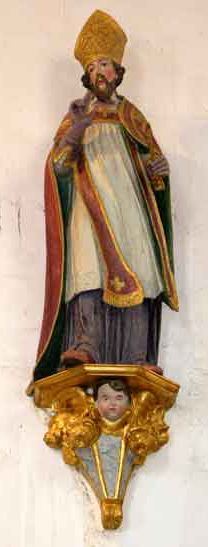 | L'évêque de Tongres, dans l'église de Saint-Servais. Il y a aussi un évêque avec sa crosse sur le dais des fonds baptismaux (ci-dessous). | Fontaine de Brétiez à Saint-Servais Le saint homme porte une clé, c'est parfois un de ses attributs : la clé d'argent que lui avait donnée saint Pierre à Rome. | |