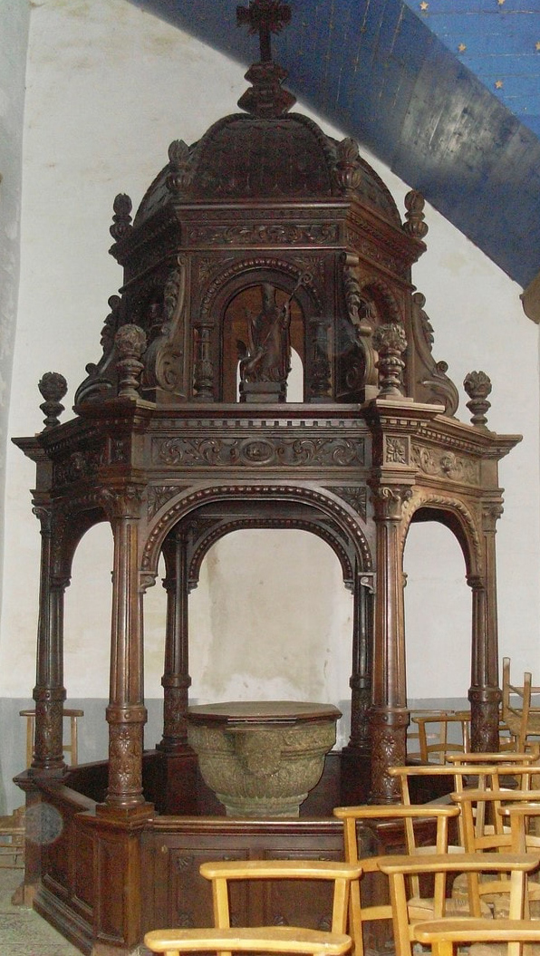bien couvert, bien boisé et fermé à clef, dans lequel font baptismal avons pareillement remarqué un bassin de plomb immobille y ayant une fontaine d'estain de glasse avec une coquille pareil estain et le chresmier et burette de pareil métal".