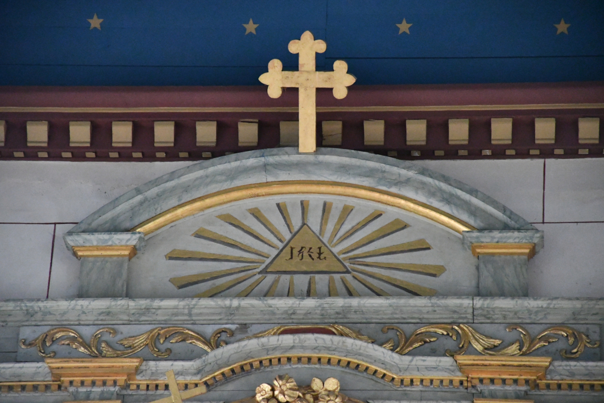 Dans les églises ou chapelles, on trouve fréquemment ce symbole au-dessus de l’autel, surtout dans l’art religieux du XVIIIᵉ et XIXᵉ siècle, le tétragramme hébreu יהוה, mais ici il est dessiné dans une graphie très stylisée qui n’est plus immédiatement reconnaissable comme de l’hébreu moderne.