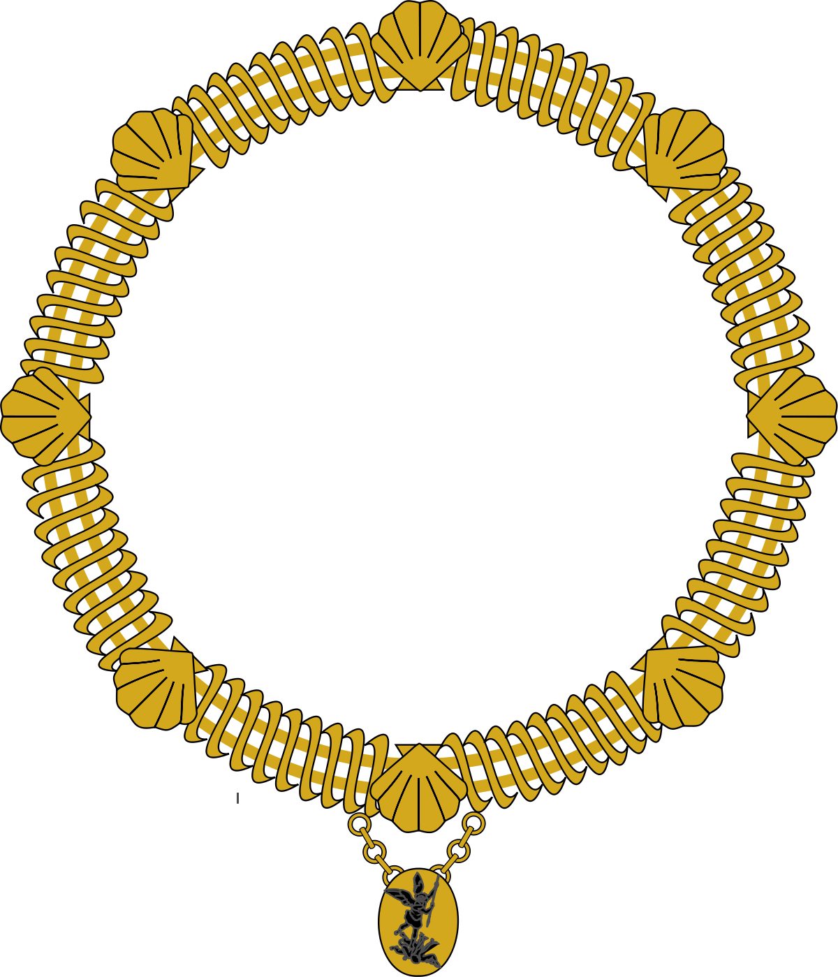 Les chevaliers ont l’obligation de porter un « collier d’or fait de coquilles lassées, l’une avec l’autre d’un double las » auquel est suspendu un médaillon représentant Saint Michel terrassant le dragon.