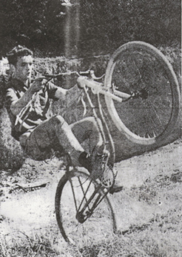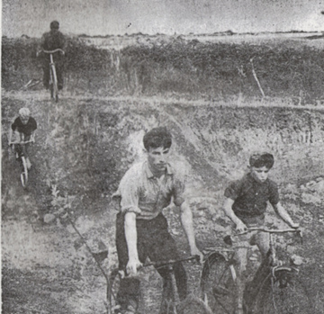 Toute l'équipe est là au départ : Pierre-René Rolland, Jean-René Diner, Roger Douval, François Abgrall, Joseph Ulvoas, André Le Goff et "ceux du bourg". Le chronomètreur est à son poste : "Trois, deux, un, partez...". Le premier vient de s'élancer... Trop vite, une pédale accroche le talus, c'est la culbute. Sans mal. Le guidon est un eu tordu. Les autres ne regardent même pas. Le second s'élance déjà, bientôt suivi de toute la meute. Les plus petits ne cèdent pas la place aux plus grands. Ils sont les plus téméraires. Ils profitent d'un virage un peu sec pour doubler, au risque de perdre l'équilibre.