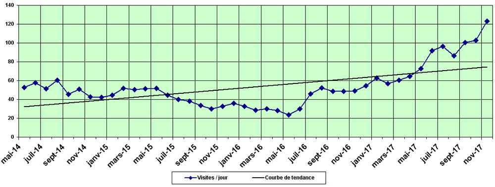 | Visites mensuelles | Visites cumulées | Consultation de pages | Cumul des pages vues | Visites par jour | Nb pages / visite | |