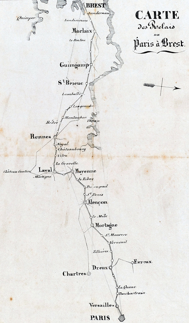 On notera aussi que le trajet de la malle-poste changera en fonction de l'extension de la ligne de chemin de fer, notamment en 1850-51 pour se connecter au nouveau terminus de Chartres. Il faut se rappeler que la ligne de chemin de fer Paris-Brest s'est construite par étapes : Paris-Chartres en 1849, Paris-Le Mans en 1854, prolongé jusqu'à Laval en 1855, puis Rennes en 1857, suivi de Guingamp en 1863, et enfin jusqu'à Brest en 1865.