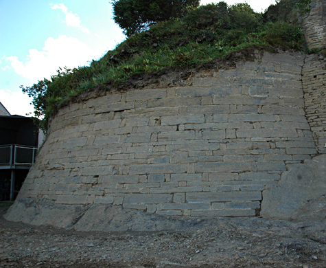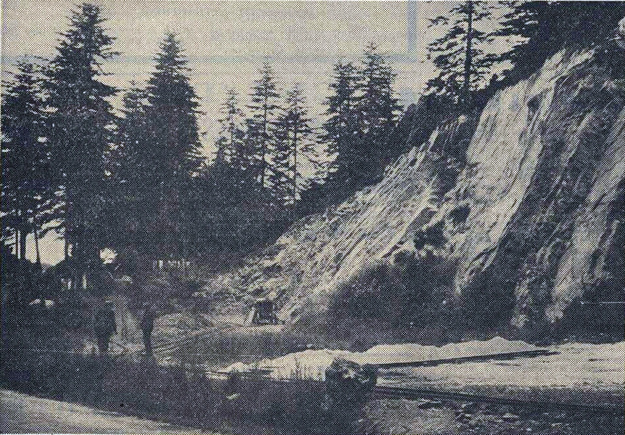 Déjà une assez grande partie de la pointe avancée du massif rocheux qui bordait la route a été enlevée ; mais il y a quelques jours, après une explosion de mine, l'attention des ouvriers qui travaillent à cet endroit fut attirée par l'apparition d'un mur paraissant en pierres sèches, recouvert d'environ 1 mètre à 1,50 mètre de terre arable, sur laquelle avaient poussé de vigoureux arbres âgés d'une cinquantaine d'années. Quelque temps plus tard, ils remarquaient, après un nouveau dégagement de blocs de granit, qu'un second mur perpendiculaire au premier venait rejoindre, à une dizaine de mètres plus loin, le premier mur découvert.