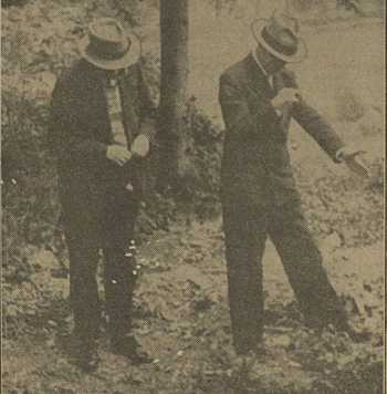 Le voici aujourd'hui nous faisant une démonstration à l'aide de son pendule (voir photo). Sur le bord d'un trou, creusé, l'hiver dernier, il va, vient, s'immobilise ; mais l'instrument n'entre en évolution qu'au-dessus du gisement. Une contre-expérience faite par un autre radiesthésiste confirme ses affirmations.