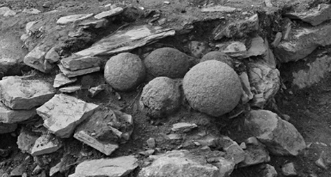Aidé de plusieurs voisins, ils parvinrent à dégager cet énorme bloc, et ensuite à le déplacer. Tout étonnés, les travailleurs remarquèrent aussitôt une excavation profonde d'un mètre cinquante environ, descendant à pic, maçonnée de chaque côté et paraissant en excellent état de conservation. Tout le monde au bourg, hommes, femmes et enfants, se mirent à l'ouvrage ; on dégagea l'entrée du souterrain, et quelques courageux jeunes gens, munis de lampes et de bougies, se glissèrent par l'étroite ouverture pour l'explorer. Ils y découvrirent des boulets en pierre, tout revêtus d'un manteau blanc.