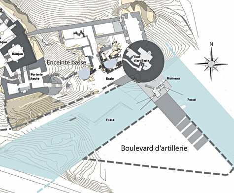 Hier, à notre tour, précédé d'un guide bénévole, qui avait déjà parcouru à plusieurs reprises la voie souterraine, nous nous glissions dans l'ouverture, resserrée de l'entrée. Nous disons "nous nous glissions" le terme est exact, car il semble que l'entrée a été bouchée intentionnellement par de nombreuses et grosses pierres. Nous parcourons en rampant sur le ventre un couloir d'une longueur de cinq à six mètres, dont la voûte est formée d'énormes pierres de taille, et nous arrivons dans une chambre assez vaste dont le plafond, formant cintre, est recouvert de nombreuses stalactites ; quant aux pierres qui encombrent environ la moitié de la hauteur de l'espace, elles sont presque toutes blanches par la couche de salpêtre qui les entoure. A droite, se remarque une ouverture assez large et assez profonde, qui devait autrefois avoir vue sur le fossé entourant l'ouvrage, à l'est et au nord. A gauche, un passage presque complètement obstrué s'offre à nos regards : on dirait l'entrée d'un soupirail. Notre guide sourit, pensant que jamais nous n'oserions le suivre dans ce trou étranglé ; il se trompe, et nous voilà sur le dos, jouant des pieds et des coudes, protégeant de notre mieux notre bougie, dont les gouttes de stéarine en fusion nous tombent sur la figure. Notre effort est récompensé : après trois à quatre mètres parcourus dans cette position, nous accédons à une seconde chambre, à volume un peu plus réduit, d'une construction remarquable, en pierres de taille et à plafond dallé ; au fond s'ouvre une cheminée ou bouche d'aération, par laquelle des pierres et de la terre sont venues obstruer encore une partie du réduit ; en face, une autre ouverture, dont nous ne pouvons comprendre l'intérêt.